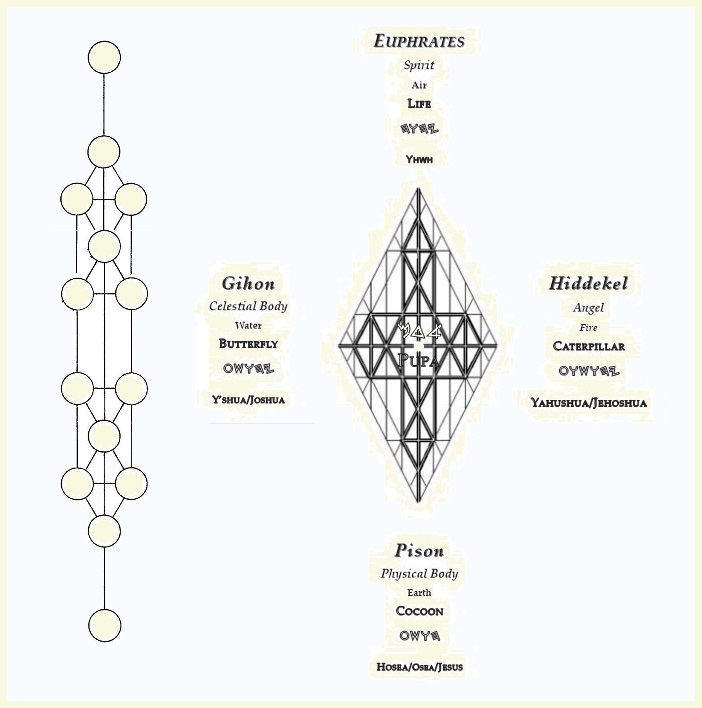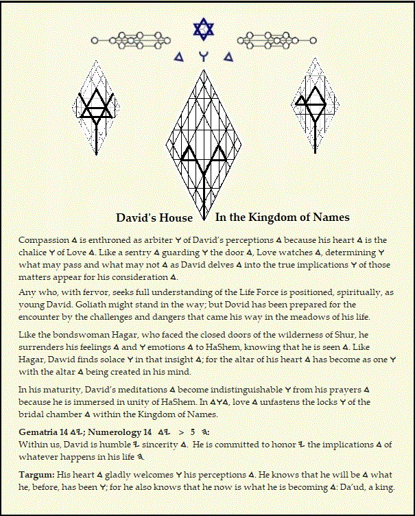 dwd.David’s name suggests the pattern of an ordinary man—a shepherd, who lives his life in a cocoon d that will empty w into another cocoon d, suggesting a continuing process that will come to an end only when portal d becomes united w with Portal d, at which time the butterfly dwd stage of life will begin, the holy life of the anointed ones within the royal line of David, the king. Whatever our stations in life, both Moses and Y’shua instructed us to call upon the Father’s Name. With no other god before us, we boldly stand before the throne of Grace, laying claim to the abundance of the Life that is in hwhy, that we might be permitted to share eternity as members of the mystical body of Yahushua HaMashiyach, each in his order as he follows Y'shua on the path to Golgotha.